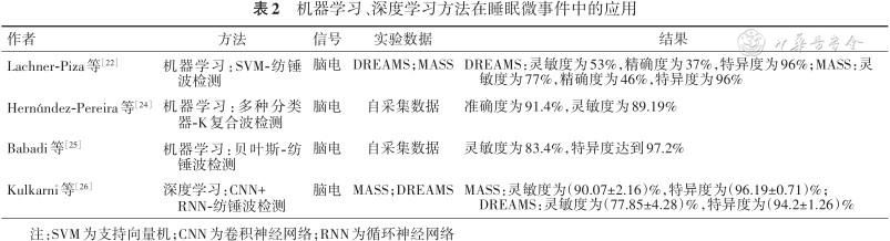 近几年随着AI技术的发展,研究人员逐渐开始利用机器学习和深度学习的方法来实现睡眠微事件的识别。表2列举了部分基于机器学习和深度学习的睡眠微事件识别研究方法。