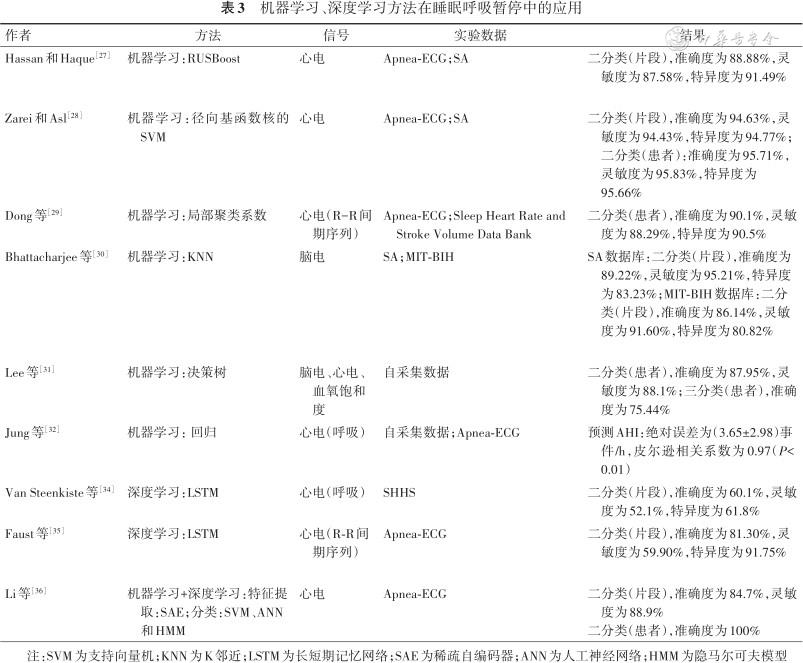 目前关于自动识别睡眠呼吸暂停的研究中,大部分是基于SVM、RF等机器学习的方法,近期少量研究开始使用深度学习方法比如LSTM来处理这一问题(表3)。