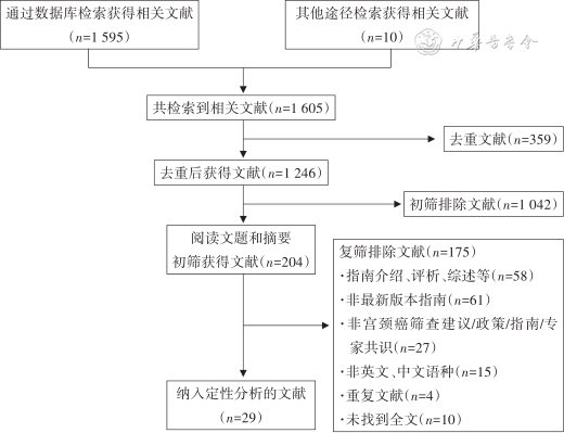 2. 排除标准:(1)宫颈癌筛查指南/专家共识/推荐意见的介绍、评析、应用指导、效果评价等;(2)非最新版本指南;(3)非宫颈癌筛查指南/专家共识/推荐意见(如原始研究);(4)非英文、中文语种;(5)重复文献或未找到全文。最终共纳入文献29篇,文献筛选过程详见图1。