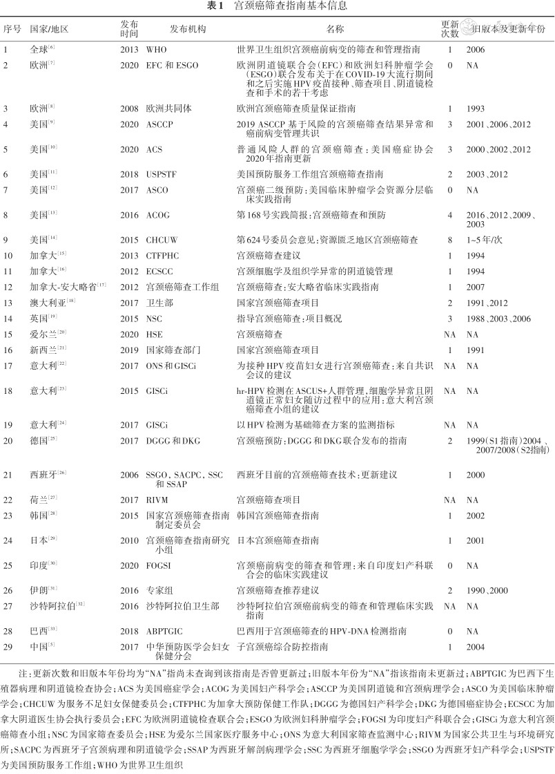 | 29 | 中国[5] | 2017 | 中华预防医学会妇女保健分会 | 子宫颈癌综合防控指南 | 1 | 2004 |