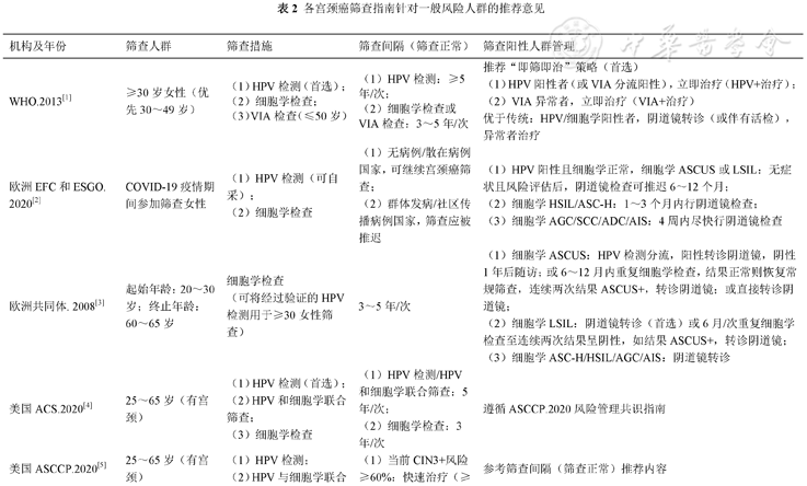 注:HPV为人乳头瘤病毒;NA指未报告;ADC为宫颈腺癌;AGC为不典型腺细胞;AGUS为意义不明的不典型腺细胞;AIS为原位腺癌;ASC-H为不除外鳞状上皮内高度病变的非典型鳞状细;ASCUS为未明意义的非典型鳞状细胞;ASCUS+为未明意义的非典型鳞状细胞及以上病变;CIN3为重度宫颈上皮内瘤样病变;HSIL为高度鳞状上皮内病变;LSIL为低度鳞状上皮内病变;SCC为鳞状细胞癌;VIA为醋酸染色肉眼观察;ACS为美国癌症学会;ACOG为美国妇产科学会;ASCCP为美国阴道镜和宫颈病理学会;ASCO为美国临床肿瘤学会;CHCUW为服务不足妇女保健委员会;CTFPHC为加拿大预防保健工作队;ECSCC为加拿大阴道医生协会执行委员会;EFC为欧洲阴道镜检查联合会;ESGO为欧洲妇科肿瘤学会;GISCi为意大利宫颈癌筛查小组;USPSTF为美国预防服务工作组;WHO为世界卫生组织