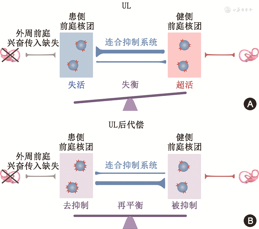 在神经环路水平,联系两侧前庭核团的连合抑制通路一直被认为参与了前庭症状及其代偿的发生。然而,该通路在静态症状代偿中的作用近年来才被逐渐证实。通过微透析技术连续监测UL模型大鼠双侧前庭核团中连合抑制通路释放的GABA含量,Bergquist等[7]发现患侧前庭核团中的GABA含量在代偿初期显著高于健侧,并且随着静态代偿的进程逐渐恢复至正常水平。有学者发现,源自下丘脑的组胺能神经传入可通过UL模型大鼠患侧GABA能连合通路神经元上突触后组胺H1受体的选择性一过性上调,增强患侧神经元的兴奋性水平以及患侧至健侧的连合抑制传入,从而促进双侧前庭核团电活动的再平衡并易化前庭代偿[8, 9](图1B)。同时,组胺H1受体的一过性上调也提示前庭代偿的发生可能具有关键期。