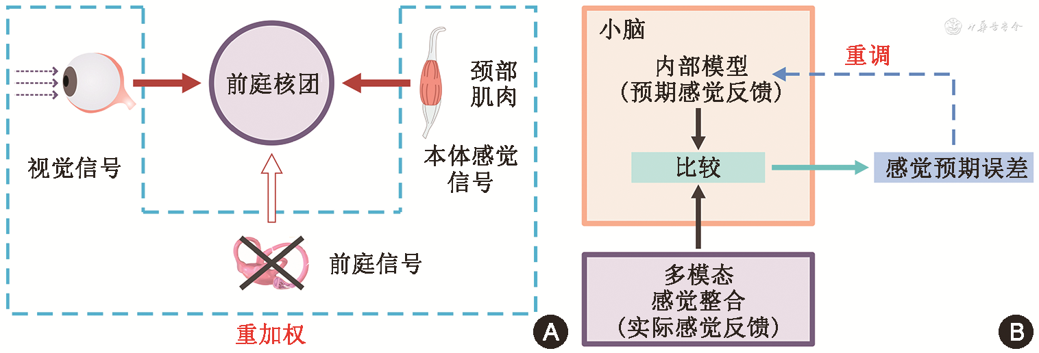 前庭反射是多模态感觉信息整合的结果。中枢前庭核团可整合前庭、视觉和本体感觉信息,介导代偿性的眼球和头部运动及躯体姿势平衡,以保持运动过程中的眼球凝视和动作协调。因此,由VOR和VSR异常引发的动态症状的代偿并非仅为局限的前庭核团内部机制,而是涉及全脑的学习过程[10]。