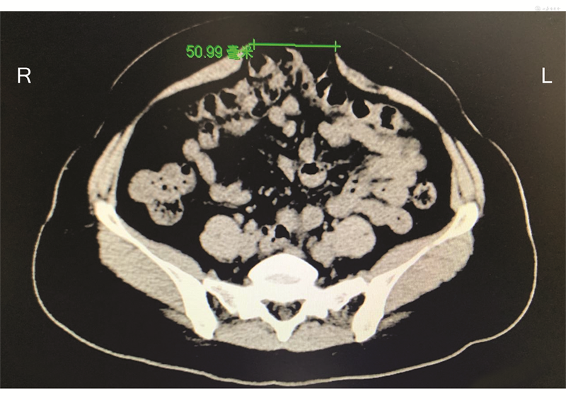 腹直肌分离较常发生于孕期、产后女性,超声检查因无创、无辐射的优点,广泛应用于临床,且其可以动态观察腹直肌分离程度,进行随访监测[13]。操作时嘱病人呈仰卧位,将超声探头长径垂直于腹白线,横向放置于腹部,在病人呼气末分别测量脐水平、脐上下2 cm位置处双侧腹直肌内侧缘距离。对于腹型肥胖病人,超声检查仍可获得较精准数据[14]。此外,CT检查(图1)和MRI检查因具有强大的图像后处理功能,可以对腹直肌分离程度、是否伴有腹腔内容物疝出等情况作出客观判断,对制订治疗方案及评价术后效果具有重要价值。临床诊断与治疗过程中,应根据病人情况、病程阶段等个体化选择恰当的测量方法。