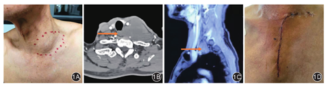 颈胸交界处解剖结构复杂,生长在此处的肿瘤也具有复杂性。颈胸交界处肿瘤的手术治疗原则是最大范围地切除肿瘤,并尽可能地保存手术部位的功能[11],其中手术切口的选择至关重要,应达到以下指标:(1)胸廓入口充分暴露;(2)能够对臂丛神经、锁骨下动脉、腋动脉和无名动脉等重要血管神经解剖性分离;(3)对胸锁乳突肌尽可能保留,防止斜颈发生;(4)维持胸锁关节的完整性及胸壁的稳定性。