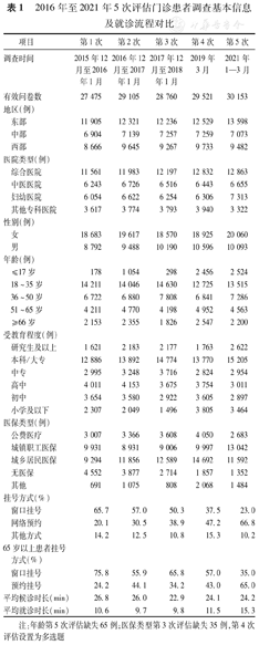 2016年至2021年5次评估门诊患者调查均包含了136所核心样本医院,来自全国31个省、自治区、直辖市及新疆生产建设兵团。136所医院中委属委管医院43所,地方医院93所;综合医院57所,中医医院31所,妇幼机构33所和其他专科医院15所;东部地区医院59所,中部地区34所,西部地区43所。门诊患者样本尽量覆盖被调查医院的主要临床科室,以结束本次诊疗的门诊患者为主,儿科患者大多由监护人代答,每所医院调查的最小样本量为200例。