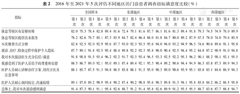 2016年至2021年5次评估结果显示,西部地区的门诊患者就诊总体满意度都低于东、中部地区。2021年第5次评估发现,西部地区门诊患者就诊满意度提升明显,特别是在门诊休息等候区提供饮水服务和足够座椅方面,在服务流程和就诊环境方面缩小了与东、中部地区的差距。西部地区多数指标的满意度有明显增幅,已基本与中部地区持平。近年来,落实国家深入实施西部大开发战略,实施一系列促进西部发展的相关政策、建设以"一带一路"为引领的西部地区医疗服务中心、加大西部地区医疗资源投入、支持西部地区医院与东、中部地区医院间开展双向交流等举措,使得西部地区改善医疗服务取得了明显成效,但仍有提升空间[14]。建议东、中部地区医院加强就诊环境方面的投入,提升患者就诊体验;西部地区应继续保持稳步发展,逐渐缩小与东、中部地区的差距。