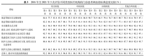 2016年至2021年5次评估不同类型医疗机构的门诊患者调查指标满意度比较(%)