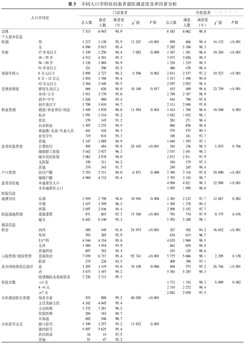 在2021年第5次调查的7 313例门诊患者和6 183例住院患者中,门诊患者的总体满意度为94.9%,住院患者的总体满意度为98.0%,住院患者就医满意度高于门诊患者。住院和门诊患者的就医满意度在医院地理分区、科室、患者性别、受教育程度、户口类型、是否因疫情延后诊疗上差异均有统计学意义(P<0.05)。此外,门诊患者的就医满意度在医院属地类别、患者医保类型、入院类型、就诊医生类别、挂号方式的构成上差异有统计学意义(P<0.05)。住院患者的就医满意度在年龄、职业类别、家庭年收入、患者居住地上差异有统计学意义(P<0.05)。见表3。
