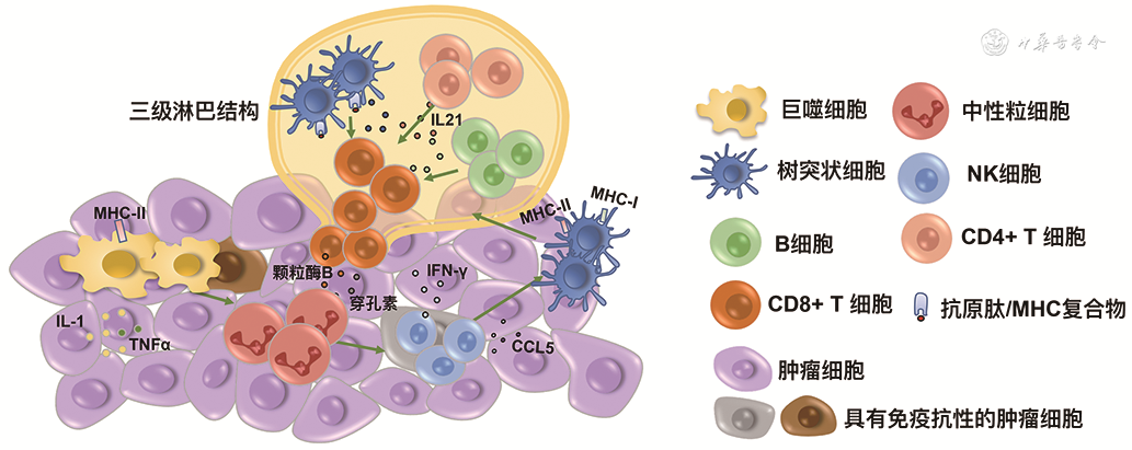 当机体内部分细胞产生病变转化为肿瘤细胞后,固有免疫系统首先发挥识别和杀伤新生肿瘤细胞的作用。病变部位的巨噬细胞被激活,吞噬作用加强,表面表达的主要组织相容性复合物(MHC)Ⅱ类分子上调,并且分泌多种细胞因子如白细胞介素1(IL-1)和肿瘤坏死因子(TNF)α,招募更多的巨噬细胞和其他的免疫细胞。中性粒细胞在趋化物质如CXCR1/CXCR2的吸引下穿越血管到达病变部位,发挥吞噬作用和细胞毒作用,使得巨噬细胞进一步募集和极化,NK细胞和NK/T细胞也被激活,并且和巨噬细胞相互促进,产生大量的穿孔素、颗粒酶以及IFN-γ等细胞因子[3],发挥抗肿瘤作用。巨噬细胞吞噬病变细胞也可以发挥抗原提呈作用,此外树突状细胞作为专职抗原提呈细胞可以被多种细胞因子激活,如经典的粒细胞-巨噬细胞集落刺激因子(GM-CSF),NK细胞分泌的树突状细胞趋化因子CCL5和XCL1[4]等。肿瘤内传统树突状细胞捕获肿瘤抗原并进行加工,在表面表达抗原肽-MHC分子复合物,并将其转运递呈给三级淋巴结构中的T细胞,在CD4+T细胞的辅助下使CD8+T细胞活化[5],激活适应性免疫。淋巴细胞是机体免疫应答功能的主要细胞群体,在肿瘤局部存在着淋巴聚集群体,称为三级淋巴结构。与次级淋巴结构类似,三级淋巴结构包含了B淋巴细胞、T淋巴细胞、树状突细胞等。三级淋巴结构中的B淋巴细胞与树状突细胞等免疫细胞,可以改变T细胞的活性和功能,因此其中的T淋巴细胞,相比于其他部位的T细胞,具有更强的活性。