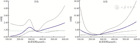 2. HUA与CKD发病风险的关联:多因素Cox回归的限制立方样条分析结果显示,非线性关系检验差异有统计学意义(P<0.05),表明SUA与CKD发病风险存在非线性关联。当男性SUA>350 μmol/L或女性>280 μmol/L时,随着SUA水平升高,CKD的发病风险呈上升趋势,见图1。