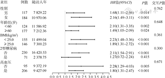 3. HUA与CKD关联的亚组及交互作用分析:将常见的可能影响HUA和CKD发病关联的相关因素分层,包括性别、年龄(<60、≥60岁)、BMI(<25.0、≥25.0 kg/m2)、2型糖尿病和高血压。除了在糖尿病组HUA与CKD的发病风险无统计学关联外;在其余亚组中,HUA与CKD的发病风险均呈显著正关联。在相乘模型中,性别、年龄、BMI、2型糖尿病和高血压与HUA在CKD发病风险的分析中均不存在交互作用(图2)。