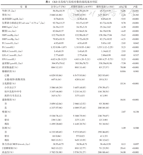 | 变 量 | 合计(n=7 276) | 非慢性肾病(n=6 975) | 慢性肾病(n=301) | t/Z/χ2值 | P值 |