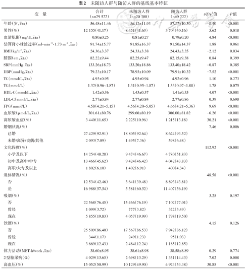 | 变 量 | 合计 (n=29 522) | 未随访人群 (n=20 300) | 随访人群 (n=9 222) | t/Z/χ2值 | P值 |