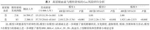 | 高尿酸血症 | 慢性肾病 发病例数 | 随访人年 | 发病密度 (/1 000人年) | 模型1 | 模型2 | 模型3 | |||
