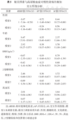 注:RERI:相对超额危险度;AP:归因比;SI:交互作用指数;模型1未调整变量;模型2调整基线年龄、性别、婚姻状况、文化程度、退休情况、吸烟、饮酒、体力活动、BMI、HDL-C、LDL-C、TC、TG、高血压、2型糖尿病和估算肾小球滤过率