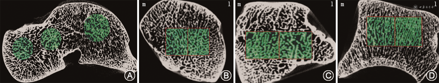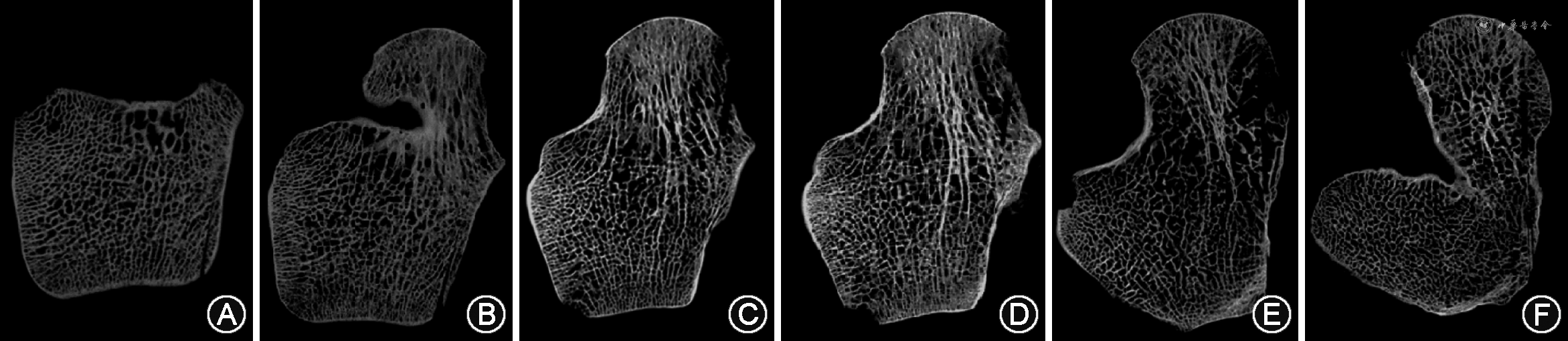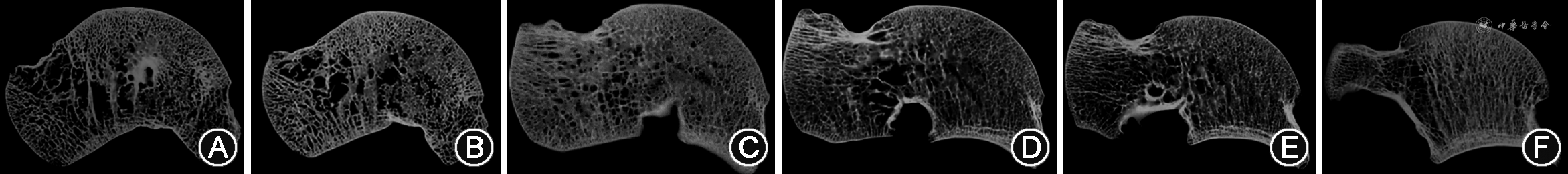 Micro-CT扫描发现距骨头、颈、体内外侧骨小梁BV/TV、Tb.Th、Tb.N、Tb.Sp以及TPF等参数并无差异,故将头、颈、体内外侧小梁作为整体计算分析,发现距骨左右侧的相同部位小梁呈对称分布,无明显差异。相较于头、颈骨小梁,体部骨小梁以板状小梁为主,小梁数量更多、间距更小、排布更为致密,连续性更好,头颈骨小梁以杆状骨小梁为主。然而本研究仍有一定的局限性:由于标本获取较为困难,标本数量仍较少;年龄分组不全面,无法研究骨内结构与年龄的相关性。