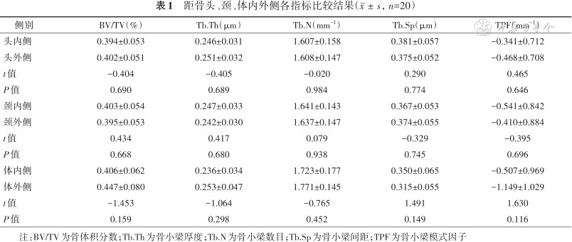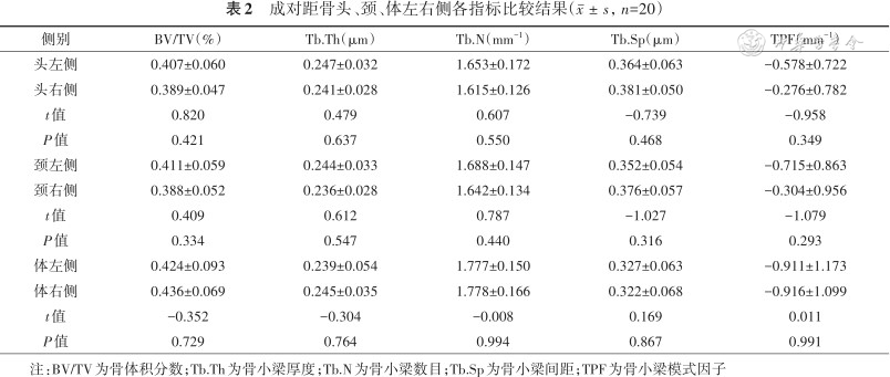 | 侧别 | BV/TV(%) | Tb.Th(μm) | Tb.N(mm-1) | Tb.Sp(μm) | TPF(mm-1) |