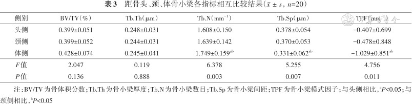 注:BV/TV为骨体积分数;Tb.Th为骨小梁厚度;Tb.N为骨小梁数目;Tb.Sp为骨小梁间距;TPF为骨小梁模式因子;与头侧相比,aP<0.05;与颈侧相比,bP<0.05