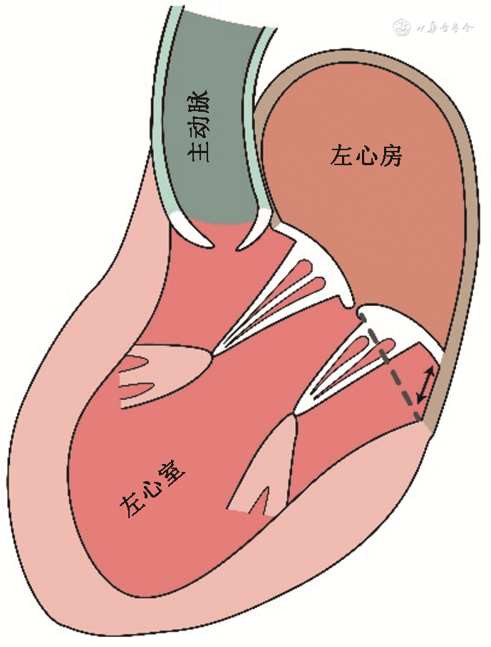 随后Hutchins等[3]对这一解剖学异常进行了系统研究,提出了MAD的概念,将其定义为二尖瓣-左心房连接点与左心室后侧壁心肌顶部之间存在较宽的分离(图1)。MAD实质上就是二尖瓣后叶的附着点向心房侧移位,导致后叶二尖瓣环明显拉长呈“帘状”,而非正常时沿房室交界平面分布的线状结构。二尖瓣前叶附着点因临近致密的“纤维三角”,所以较少发生MAD[4, 5]。MAD的发病机制目前还不清楚,无法确定它是先天性、退行性还是后天获得性结构异常,也缺乏遗传学与基因学的研究证据[1]。