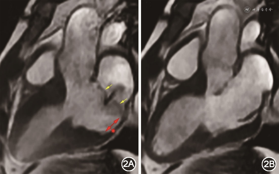 MAD的影像学表现为:左心房壁-二尖瓣环后叶连接点与左心室后侧壁顶部之间存在不同程度的分离,可伴有后叶二尖瓣环的收缩期外向运动,即卷曲运动(curling motion)。影像学检查时,在胸骨旁长轴切面、心室收缩末期最易观察到MAD。心室舒张时左心室游离壁顶部正好位于二尖瓣后叶附着点下方,二者呈纵向线性毗邻关系,MAD可能会被掩盖;当左心室后外侧壁心肌收缩时,二尖瓣环滑动使后叶附着点与左心室游离壁顶部的距离拉大,形成可见的MAD,分离距离从1 mm到>10 mm不等(图2)。文献报道中MAD的诊断标准并不统一,但一般认为分离距离>2 mm即可诊断[1,4,6, 7],但是否所有符合诊断标准的MAD都有临床意义尚不明确。经胸超声(transthoracic echocardiography,TTE)、经食管超声(transesophageal echocardiography,TEE)和心脏磁共振(cardiac magnetic resonance,CMR)等无创影像学检查是诊断MAD的主要方法,但目前作为参考标准的影像学技术尚未确定。TTE是诊断MAD的重要工具,其简单有效、成本低廉,可以很好地评估二尖瓣形态和二尖瓣反流,但容易受声窗不足、二尖瓣钙化、空间分辨率较低和操作者经验的影响,导致MAD的漏诊率较高。TEE对MAD的检出率较TTE稍高,但其主要应用于外科术前评估二尖瓣的解剖结构,且TEE为半侵入性检查,因此在临床上并不常规应用。CMR的空间分辨率高,可清晰辨别相邻的组织结构,因此能更敏感地发现MAD,其对MAD的检出率最高,可作为诊断MAD的金标准,同时CMR还可以通过延迟钆增强成像识别可能并存的心肌纤维化[6]。有研究报道,心脏CT(cardiac computed tomography,CCT)也可用于检测MAD[8],CCT有很高的空间分辨率,可进行各向同性三维图像重建,因此能很好地识别MAD,且CCT较CMR更为普及、检查过程省时简便,应用于MAD的筛查和诊断有较好前景。