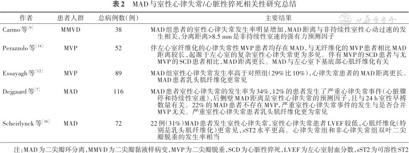 | Essayagh等[12] | MVP | 89 | MAD组室性心律失常发生率高于对照组(29%比10%),心律失常患者的MAD距离更长。MAD患者乳头肌纤维化更常见 |