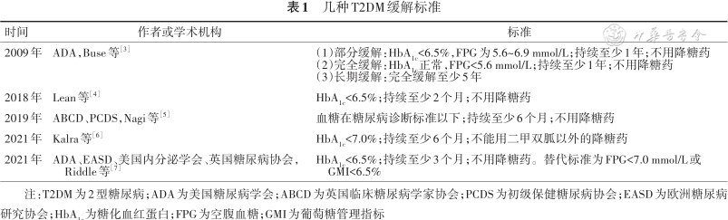 Lean等[4]在著名的糖尿病缓解临床试验(Diabetes Remission Clinical Trial,DiRECT)中使用的标准为停用降糖药的情况下HbA1c<6.5%至少2个月。2019年,英国临床糖尿病学家协会(Association of British Clinical Diabetologists,ABCD)和初级保健糖尿病协会(Primary Care Diabetes Society,PCDS)发布的T2DM缓解立场声明中,将糖尿病缓解定义为患者停用降糖药后血糖在糖尿病诊断标准以下至少6个月[5]。Kalra等[6]提出的标准为HbA1c<7.0%、持续至少6个月、不能用二甲双胍以外的降糖药。