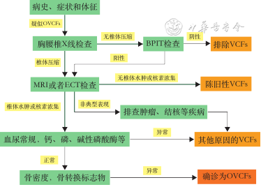 根据患者的性别、年龄、临床表现、影像学检查,结合骨密度测量结果,可作出OVCFs的诊断。对于一些X片没有明显压缩骨折,但背痛诱发试验(BPIT)阳性的患者,仍建议进行MRI检查,避免遗漏隐匿性的胸腰椎骨折[29]。入院后检查血尿常规,肝肾功能,血钙、磷、碱性磷酸酶等,可选择性检查红细胞沉降率、C反应蛋白、性腺激素、血清25羟维生素D、1,25二羟维生素D、甲状旁腺激素、24 h尿钙和磷、甲状腺功能、皮质醇、血气分析、血尿轻链、肿瘤标志物、放射性核素骨扫描、骨髓穿刺或骨活检等,结合病椎的X线、CT和MRI影像学表现,有助于发现和排除转移性骨肿瘤、胸腰椎结核、多发性骨髓瘤、甲状旁腺功能亢进、类风湿性关节炎等导致的继发性骨质疏松以及各种先天或获得性骨代谢异常疾病[28,30]。OVCFs诊断流程如图1所示。