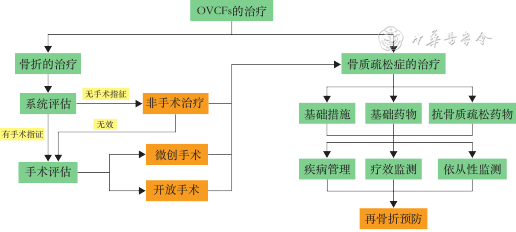 复位、固定、功能锻炼和抗骨质疏松[30,38]是骨质疏松性骨折的基本治疗原则,同样适用于OVCFs。稳定骨折椎体,缓解疼痛,加强功能锻炼,并进行规范的抗骨质疏松治疗,预防再骨折,方能取得良好疗效。OVCFs治疗流程如图2所示。