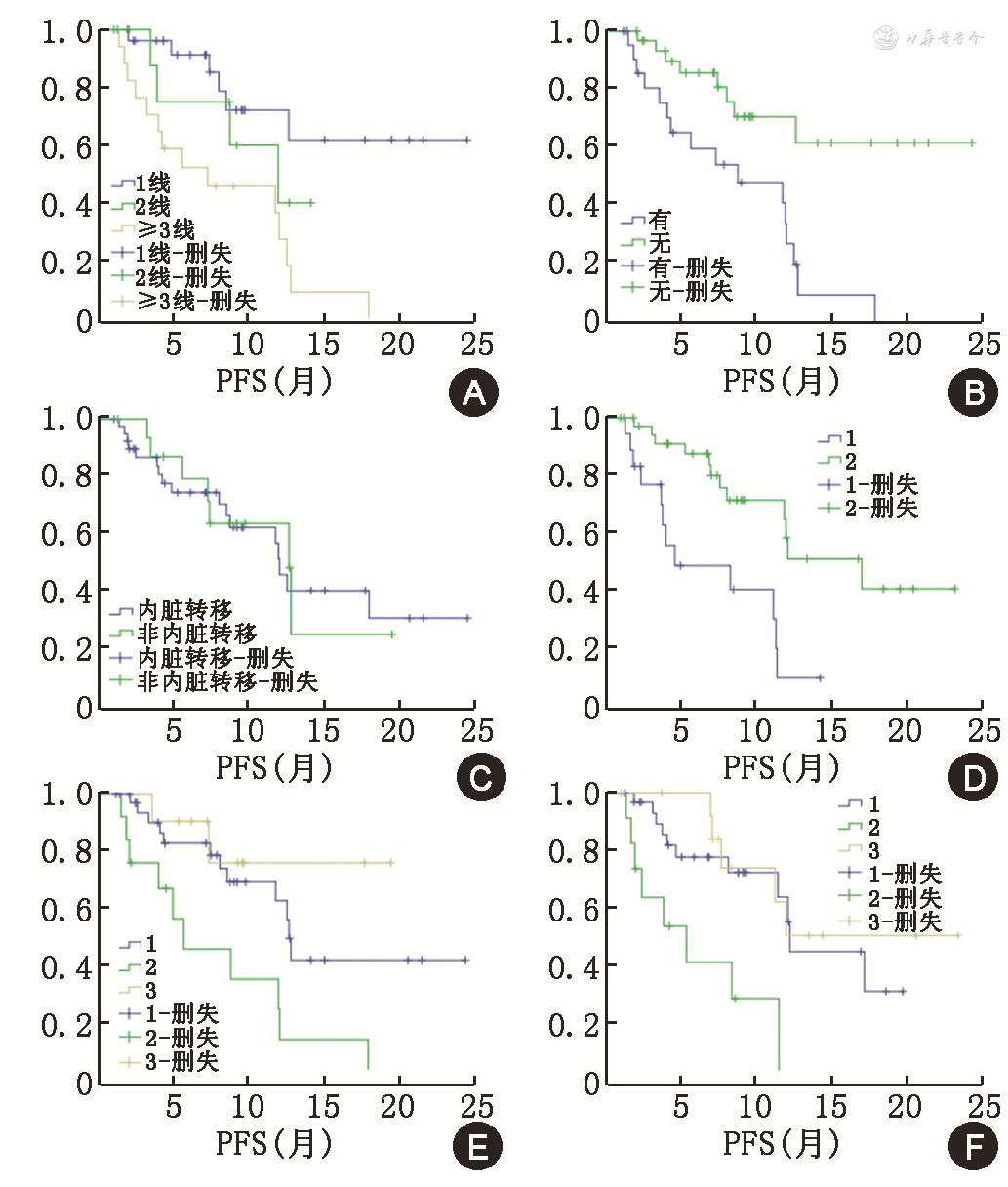 注:纵坐标为生存率;A:1、2、3线治疗情况;B:之前是否有解救化疗;C:是否有内脏转移;D:是否有肝状转移(1是,2否);E:DFS是否≥2年(1),<2年(2),首诊Ⅳ期未经治疗(3);F:内分泌治疗是否敏感(1敏感,2继发耐药,3原发耐药)