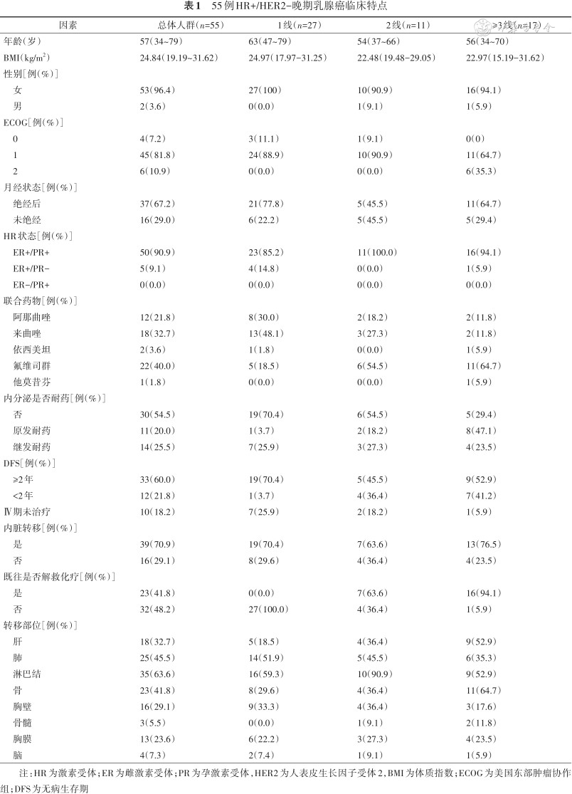 收集2018年9月至2020年9月在河南省肿瘤医院接受哌柏西利治疗的晚期乳腺癌患者(HR+/HER2-)信息,共55例,均为女性,中位年龄57(34~79)岁。汇总一般病史资料、疾病特征。分析客观缓解率(ORR)、疾病控制率(DCR)、无进展生存期(PFS)、至治疗失败时间(TTF)、安全性及相关预后因素分析。
