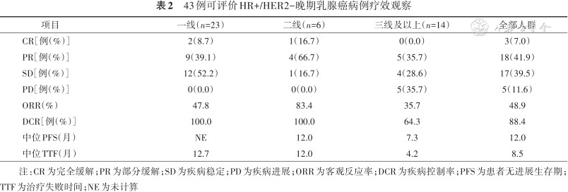 43例可评价HR+/HER2-晚期乳腺癌病例疗效观察