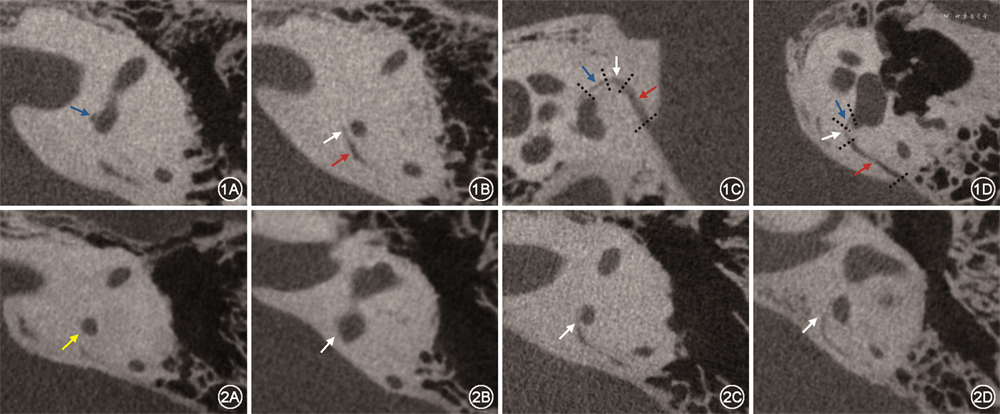 1. 扫描仪器:采用Ultra3D-SE超高分辨力CT扫描仪(北京朗视仪器股份有限公司)进行扫描。使用小视野高清模式,对双侧颞骨分别扫描成像,患者取仰卧位,扫描范围覆盖岩锥弓上隆起至茎乳孔,扫描参数:管电压100 kV、管电流3.5 mA,最小重建体素大小为0.05 mm×0.05 mm×0.05 mm。本研究观察重建体素为0.1 mm×0.1 mm×0.1 mm,重建视野为65 mm×65 mm。扫描层厚及层间距为0.1 mm,层数370层。