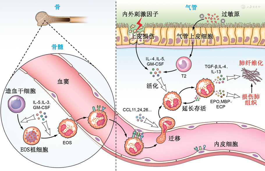关于EOS致病的机制,目前认为EOS通过其特异性的嗜酸粒细胞过氧化物酶(eosinophil peroxidase,EPO)及主要碱性蛋白(major basic protein,MBP)产生氧化应激,破坏细胞外基质的结构组织,通过颗粒蛋白(如嗜酸阳离子蛋白)或通过抗体依赖细胞介导的细胞毒作用,引起组织损伤。EOS浸润还可能通过释放转化生长因子-β、IL-4和IL-13来直接促进纤维化,或通过EPO或MBP刺激组织上皮细胞表达纤维化介质而间接促进纤维化。
