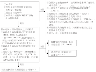 4.血液肿瘤:(1)外周血涂片及骨髓穿刺涂片细胞学分类计数;(2)骨髓活检病理学;(3)血清维生素B12;(4)血液或骨髓行荧光原位杂交技术(fluorescence in situ hybridization,FISH)或聚合酶链反应(polymerase chain reaction,PCR)检测FIP1L1-PDGFRA融合基因(如FIP1L1-PDGFRA融合基因阳性,则进一步检测PDGFRA,PDGFRB,FGFR1或PCM1-JAK2基因重排);(5)血液或骨髓行PCR检测T细胞受体基因重排;(6)血液或骨髓行流式细胞术测定免疫表型;(7)骨髓染色体核型分析(如染色体提示有5q31~33或8p11~12或9p24,则需进一步FISH检测PDGFRB,FGFR1或JAK2基因重排);(8)骨髓基因的二代测序(next generation sequencing,NGS);(9)血清类胰蛋白酶水平(如血清类胰蛋白酶水平升高,则需进一步行骨髓CD117、类胰蛋白酶及CD25免疫组化检测)。