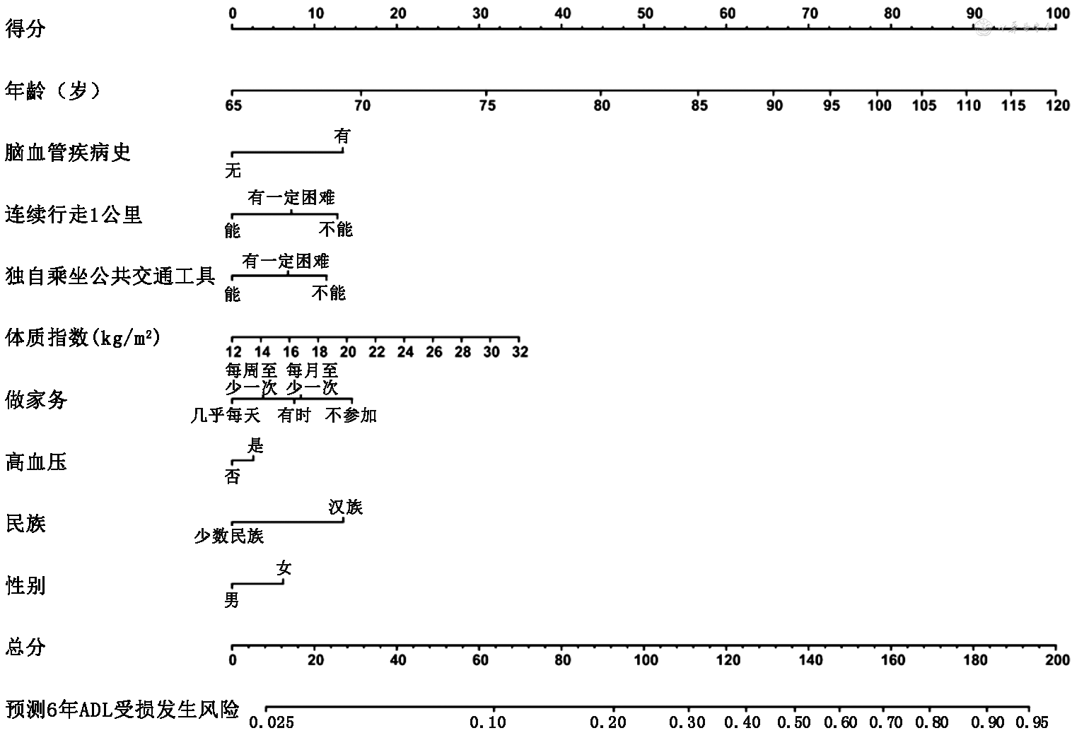 注:ADL为日常生活自理能力;列线图最上方的得分项为评分尺,下方为预测因素及对应得分,根据总分预测ADL受损发生风险