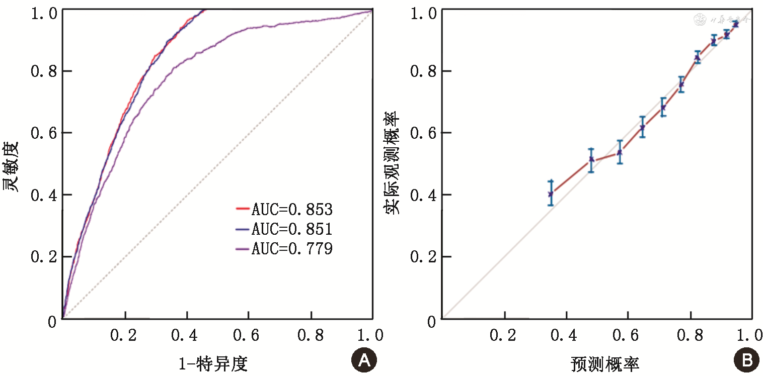 3.模型区分度和校准度评价:模型对ADL受损发生风险预测的AUC值为0.853,提示模型区分能力较好(图2A)。最大约登指数为0.560,此时对应风险切点值为23.2%,灵敏度为96.1%,特异度为59.9%。校准曲线结果表明各组预测概率和实际观测概率具有较好的一致性(图2B)。