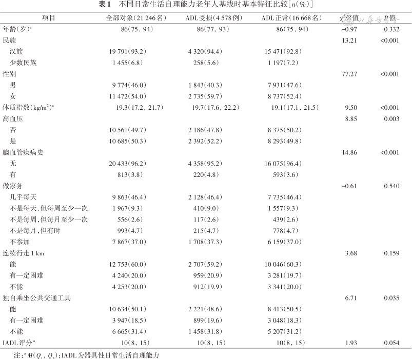 | 项目 | 全部对象(21 246名) | ADL受损(4 578例) | ADL正常(16 668名) | χ2/Z值 | P值 |