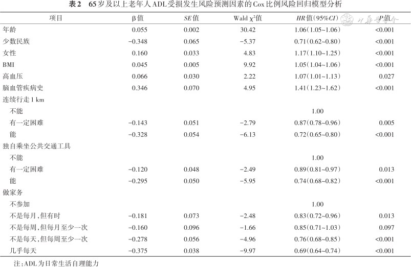 65岁及以上老年人ADL受损发生风险预测因素的Cox比例风险回归模型分析