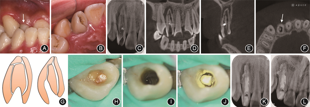 (3)诊断:12慢性根尖周炎;12牙内陷(Oehlers Ⅲb型)(图2G);慢性牙龈炎。