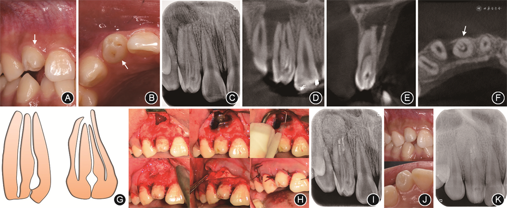 手术过程:见图3H。牙冠内陷腔窝洞预备,树脂充填抛光;复方氯己定漱口,颌面部消毒,复方盐酸阿替卡因注射液(必兰,法国碧兰公司)局部浸润麻醉,于11—13唇侧前庭沟处行沟内切口,13远中垂直切口,翻全厚瓣,定位根尖,球钻去除唇侧少量骨壁,挖匙刮除根尖周肉芽组织,亚甲蓝染色,显微镜下高速涡轮机根尖修形,超声根管倒预备6 mm(AS 6D,法国赛特力公司),iRoot BP Plus(Innovative Bio Creamix Inc,加拿大)倒充填,生理盐水冲洗创口,放置0.5 g骨粉(Bio-Oss,Geistlich,瑞士),覆盖骨膜(Bio-Guide,Geistlich,瑞士),间断复位缝合。术后即刻根尖片显示12患牙根尖1/3部分根管内充填高密度影像,根尖骨质缺损区及牙槽间隔缺损处可见骨粉充填致密高密度影像(图3I)。术后12个月复查患牙无不适,功能正常,根尖片显示根尖周骨愈合良好(图3J,K)。