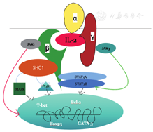 IL-2主要通过与细胞表面IL-2R结合发挥作用,静息状态下,IL-2R并不是以二聚体或三聚体形式存在。接受刺激后,IL-2与CD25(α亚单位)结合,IL-2发生变构,然后募集CD122(β亚单位)和CD132(γ亚单位)形成四聚体复合物[19]。当IL-2浓度高时,也可与中亲和力受体结合。细胞因子-受体复合物形成后,CD122亚单位(β亚单位)胞质内结构发生改变并结合JAK1,而CD132亚单位(γ亚单位)耦合JAK3,结合后引起β和γ亚单位酪氨酸磷酸化。其中,β亚单位Y395和Y498磷酸化、并募集STAT5A、STAT5B、STAT3,而Y341磷酸化则募集SHC1(图1)。与受体结合后,JAK使STAT5和SHC1酪氨酸磷酸化,其中,STAT5蛋白磷酸化导致STAT5形成二聚体,影响细胞核翻译,以及STAT5介导的转录。STAT5a/b磷酸化后转移到细胞核内,通过与目标基因结合调控基因转录[20]。SHC可激活MAPK和PI3K通路,这些通路对于细胞分化和成熟有重要作用[21]。通过上述通路,细胞膜上结合的IL-2信号迅速传导至细胞核,诱发Foxp3转录因子,以及T-bet和GATA-3的表达,这些转录因子在Treg、Th1、Th2细胞的分化中有重要作用[13,22]。同时,持续的IL-2刺激,可抑制RORγ和Bcl6表达,减少Th17和Tfh细胞形成[14]。信号转导完成后,四聚体迅速内化,IL-2、CD122、CD132降解,CD25则重新回到细胞表面[3]。