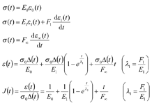 式中:σ(t)、ε(t)和J(t)分别为伯格斯模型系统的总应力、蠕变应变和蠕变柔量,ε0(t)、ε1(t)和ε∞(t)分别为瞬时弹性元件、Kelvin元件和阻尼器的应变,E0、E1、F1、F∞分别为对应的系数,λ1为Kelvin模型蠕变推迟时间。