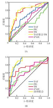 术前单项TM检测对恶性肿瘤患者发生VTE的预测价值较高,TAT和TM联合检测的预测价值优于单项TM(表4、图1)。术后单项TAT检测对恶性肿瘤患者发生VTE的预测价值较高,四项联合检测的预测价值优于单项TAT(表5、图1)。