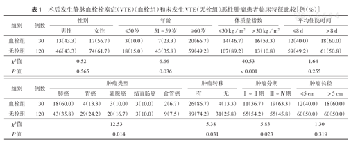 术后发生静脉血栓栓塞症(VTE)(血栓组)和未发生VTE(无栓组)恶性肿瘤患者临床特征比较[例(%)]