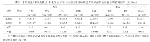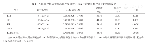 TM可作为早期预测恶性肿瘤患者术后VTE发生的敏感指标,用于提前预防;TAT可作为预测VTE即将发生的特异指标,用于及时干预。TAT、PIC、TM、tPAIC联合检测对VTE的预测价值更高,同时可选用PIC评估出血风险。