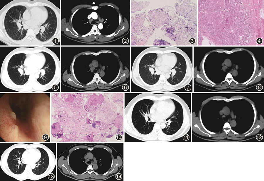患者于2016年5月30日在我院门诊行第一次支气管镜检查,镜下见黏膜普遍水肿,气道内少量黏稠分泌物,左主支气管远端及左上叶支气管开口可见黏膜多发小结节。N7淋巴结穿刺活检、支气管肺泡灌洗液(BALF)病原学示细菌、真菌涂片及培养阴性,抗酸染色阴性,结核/非结核分枝杆菌培养阴性(-)。BALF细胞分类中淋巴细胞占51%,吞噬细胞49%;CD4+/CD8+ T细胞4.3(参考范围:0.9~2.0)。病理示(左主支气管)黏膜显慢性炎;(N7)涂片见淋巴细胞及上皮样细胞,可见上皮样肉芽肿(图3)。外院超声示双侧前臂上段伸侧皮下脂肪层探及不匀质低回声区,范围42 mm×8 mm(右),25 mm×7 mm(左),26 mm×5 mm(左),边界清,彩色多普勒示其内血流信号丰富。2016年5月17日外院行左侧前臂皮下结节切除术,病理结果(图4)为非干酪样坏死性类上皮肉芽肿,大小较均匀一致,PAS及抗酸染色均为阴性;我院病理科会诊(前臂结节)符合结节病。考虑患者结节病可能性大,6月3日加用泼尼松(30 mg,1次/d)口服,口服1个月后,7月3日减量(25 mg,1次/d),此后建议每10天减半片,患者未遵医嘱减量,继续服用25 mg至2016年9月复诊时。经激素治疗后,自觉呼吸困难好转,右侧前臂皮下结节明显缩小,复查超敏C反应蛋白1.8 mg/L(正常参考值:<8 mg/L),ACE为45 U/L(正常参考值:0~55 U/L)。复查胸部CT(图5,6)可见纵隔肺门多发淋巴结较前增大,最大者短径约18 mm。建议继续泼尼松25 mg规律减量,2个月后复查。2016年11月复诊,右前臂皮下结节消失。胸部CT(图7,8)可见纵隔肺门淋巴结较前进一步增大,最大者短径约21 mm。由于患者在诊断“结节病”服用激素后,皮下结节缩小消失,但纵隔肺门淋巴结进行性增大,结节病诊断存疑,2016年11月11日行第二次支气管镜检查。镜下见右主支气管、右上叶中间段分嵴、右下叶基底段开口等处黏膜多发白色结节(图9),黏膜活检示慢性炎。EBUS-TBNA穿刺N4R和N8淋巴结,淋巴结穿刺涂片镜下见淋巴细胞、上皮样细胞及多核巨细胞;穿刺病理(图10)中见淋巴细胞团及上皮样细胞肉芽肿结节,伴纤维组织增生,未见坏死,特染显示PAS染色(-),抗酸染色(-),六胺银染色(-),符合肉芽肿性病变。右肺中叶外侧段BALF送检病原学涂片、培养均为阴性。因临床不能完全除外合并结核感染,2016年11月8日泼尼松减量为15 mg(1次/d),1周后减量为10 mg(1次/d)维持2个月,于2017年2月停用。同时于2016年11月23日加用四联抗结核治疗。具体为:异烟肼0.3 g(1次/d)+利福平0.45 g(1次/d)+乙胺丁醇0.25 g(3次/d)+吡嗪酰胺0.5 g(3次/d)口服。2016年12月因高尿酸血症停用吡嗪酰胺改为三联抗结核治疗。先后于2017年2、9月及2018年4月(图11,12)复查胸部CT显示纵隔肺门淋巴结进行性缩小。于2018年5月抗结核治疗满18个月后停药。此后患者在呼吸科门诊规律随访,无呼吸道症状,皮肤无结节、皮疹。末次随访时间为2021年10月,胸部CT(图13,14)示纵隔肺门淋巴结大小稳定。