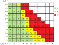 环境温度为18~25 ℃,相对湿度40%~70%时,人体感觉最舒适[40]。运动过程中人体代谢加快、产热加剧,身体与环境的热交换也增加,此时最适宜的环境温度为15~22 ℃,相对湿度为40%~65%,这种环境下人体内外温差适宜、热交换稳定,不易出现代谢紊乱,人体温度可在运动中维持相对稳定的37.5 ℃左右。若湿度过高,环境水汽趋于饱和、气压降低,可抑制人体散热、影响正常排汗,体温调节机能无法发挥作用,影响心肺耐力,严重时出现体温过高。所以,气温31 ℃以上时,相对湿度应在40%以下。可使用热指数(描述体感温度舒适度的指标)辅助判断环境温湿度是否适宜,不同环境温度与湿度下热指数分布详见图2,热指数≥31时造成人体损伤的风险增高[41]。哮喘儿童应根据不同季节,选择每天中环境温湿度适宜的时间段进行室外运动,当室外气候条件不理想时考虑进行室内活动。