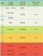 | 中等强度 | 在绝对尺度上,中等强度指3~6 MET之间的运动量。个人主观评估量表上(0~10分),中等强度为5~6分 |