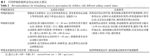 不同哮喘控制状态的运动处方建议见表2。